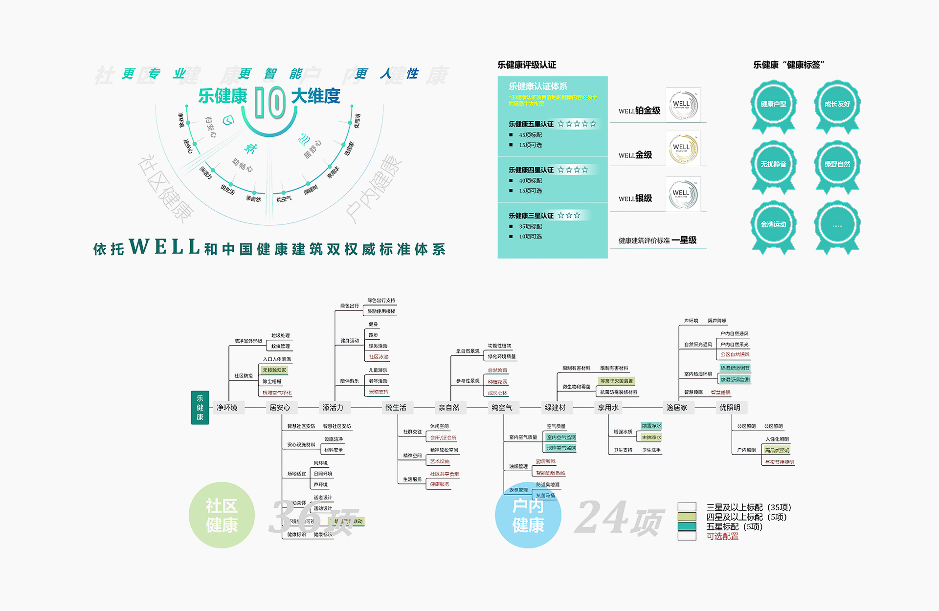 雅居樂健康住區(qū)評價標準共包含60項技術要點,按照三星/四星/五星進行分級。樂健康三星作為我們健康產品底線包含35項標配項,10項選配項,對標WELL銀級、中國健康標一星設計要求;五星作為我們的最高配置標準,包含50項標配項,10項選配項,對標WELL鉑金級設計要求。