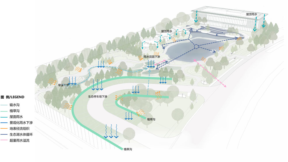 項目現(xiàn)場依形就勢,利用現(xiàn)狀水塑造海綿水系,打造低生態(tài)影響、低維護的生態(tài)濕地公園;公園綠地依靠雨水花園、下凹綠地等對雨水進行過濾下滲,超量雨水溢流對湖體進行補水;停車場由于汽車帶來機油和重金屬的影響,不再排入湖體,直接在植草溝進行下滲凈化;湖體通過水泵循環(huán)造流,防止水系局部富營養(yǎng)化,并通過植被群落配置及各類生物,構建穩(wěn)定的水生態(tài)系統(tǒng)。